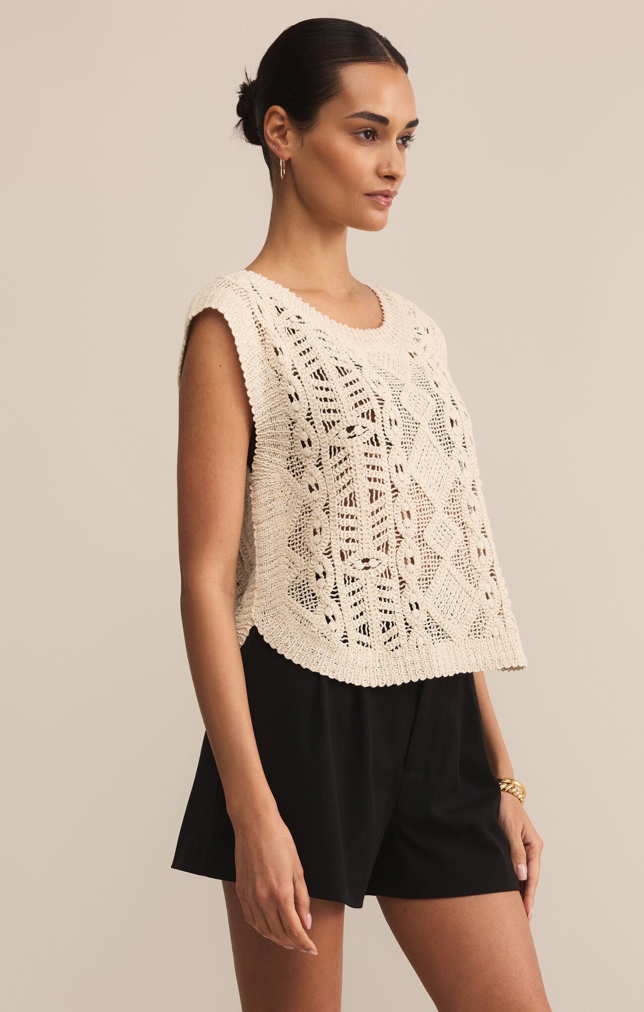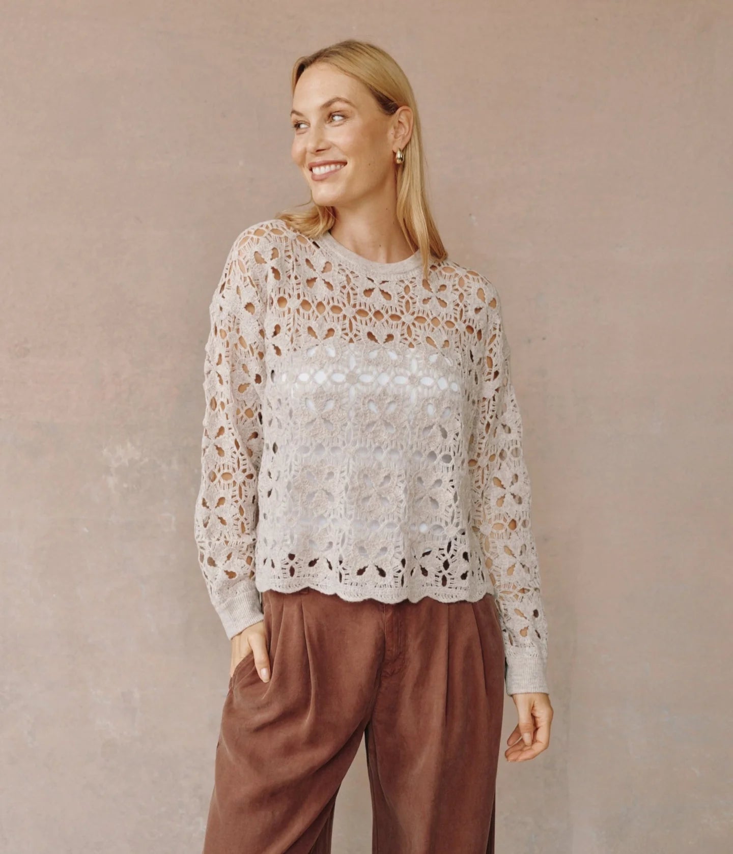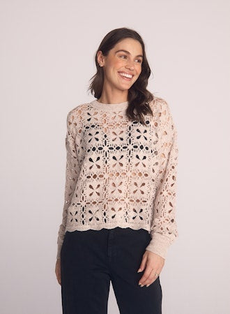 Bella Dahl Crochet Crew Neck Sweater Soft Almond